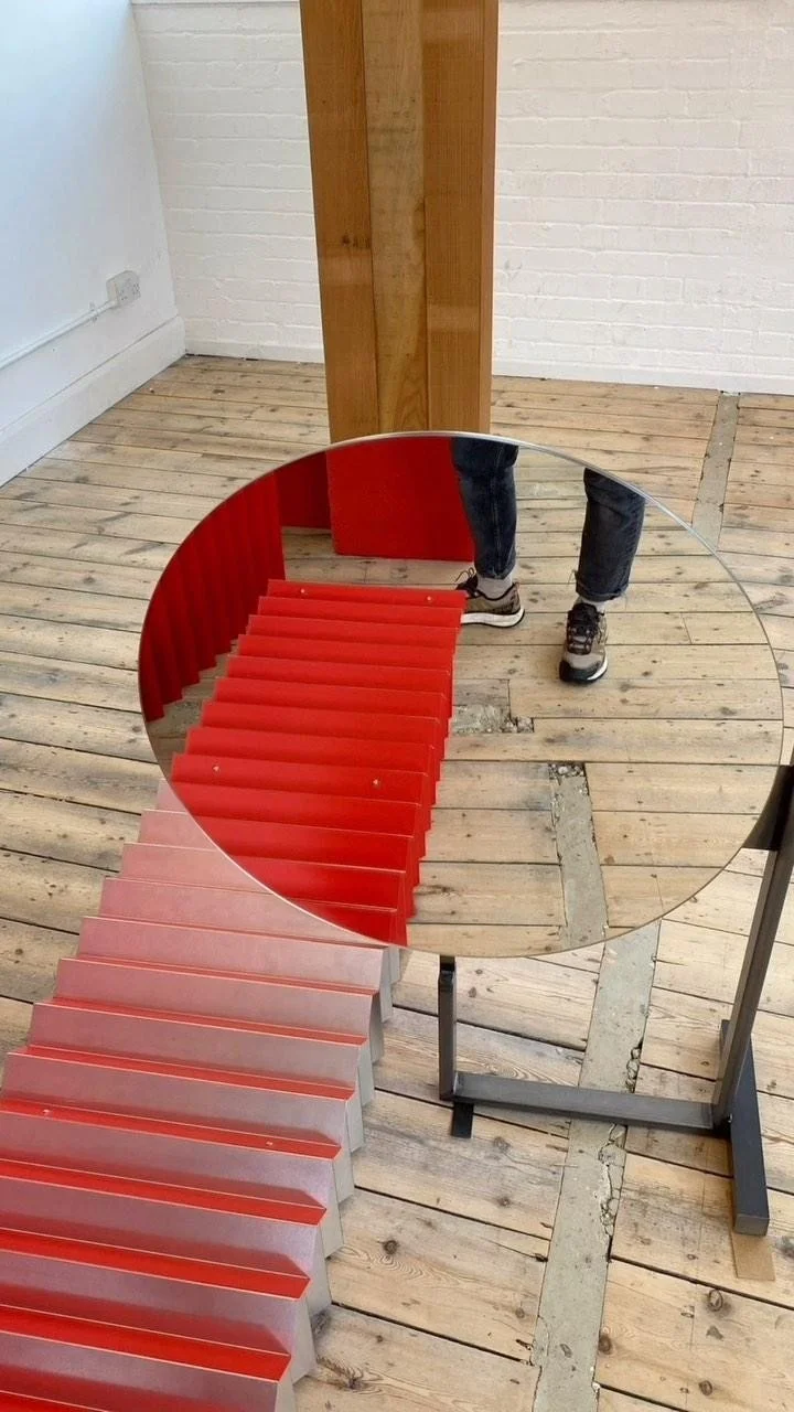 The different elements all interact with the mirror from various perspectives, constantly changing as the visitor moves around it. At one point the reflection in the mirror comes together as a solid block colour, representing the perfect alignment of all the elements.