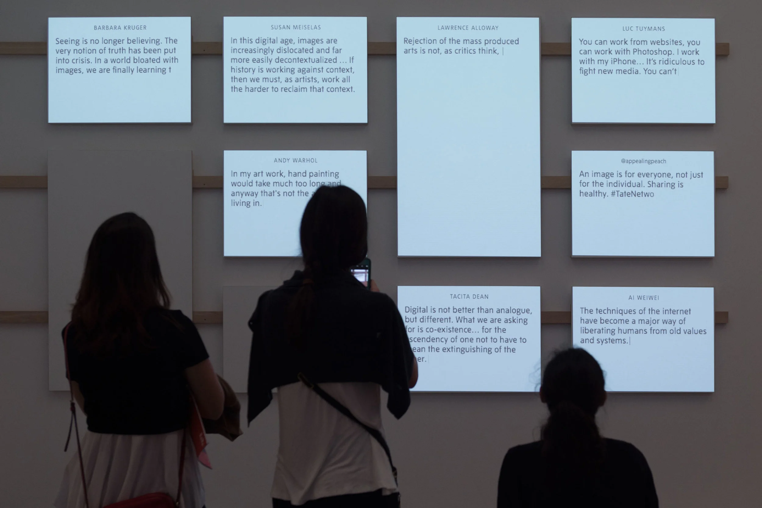 Tate Modern commissioned Hunting & Narud to design permanent installation over four separate rooms. This installation brings together quotations from artists as well as tweets from the audience over the impact of the mass media and the way me make and look at art.